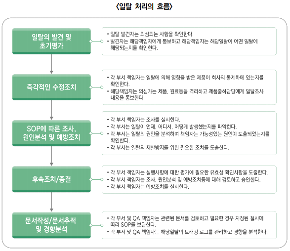 제조 또는 품질관리 중의 일탈에 대해 조사를 한 후 필요한 조치를 마련하고 일탈의 반복을 방지할 수 있는 조치가 이루어져야 한다.