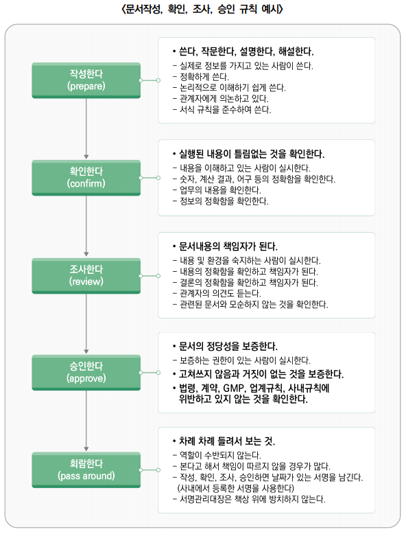 다. 문서는 작업자가 알아보기 쉽도록 작성하여야 하며 작성된 문서에는 권한을 가진 사람의 서명과 승인연월일이 있어야 한다.