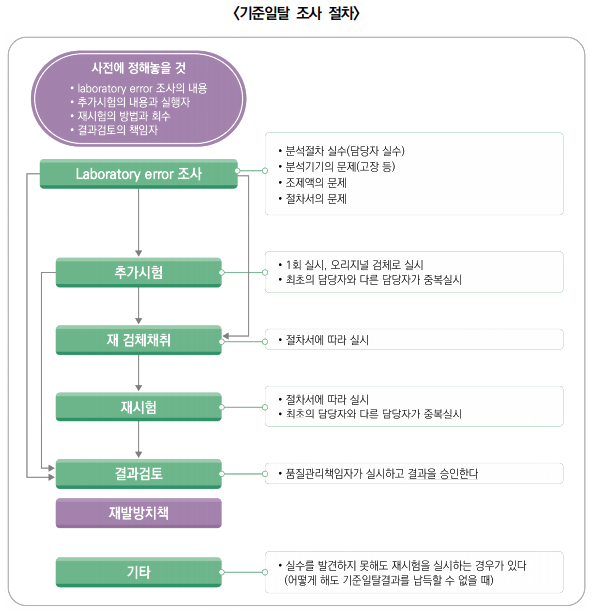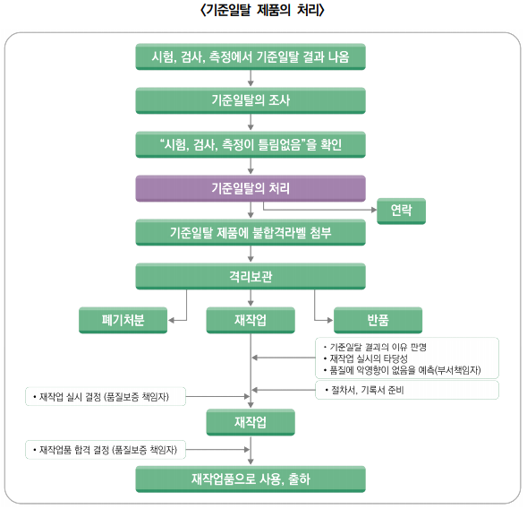 사. 기준일탈이 된 경우는 규정에 따라 책임자에게 보고한 후 조사하여야 한다. 조사결과는 책임자에 의해 일탈, 부적합, 보류를 명확히 판정하여야 한다.