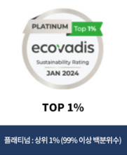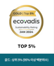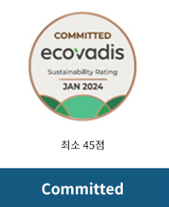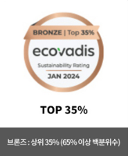 에코바디스 평가 등급은 환경, 노동/인권, 윤리, 지속가능한 조달 총 4가지 항목을 평가하여 상위 35% 이상 기업에게만 수여됩니다.