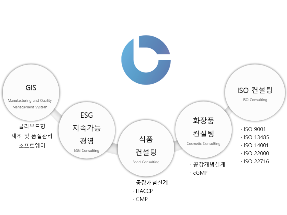 GMP, cGMP, HACCP, ISO (9001, 14001, 22000, 22716, 13485), ESG 등 식약처 인허가 및 국제 표준 인증 컨설팅을 진행 합니다.