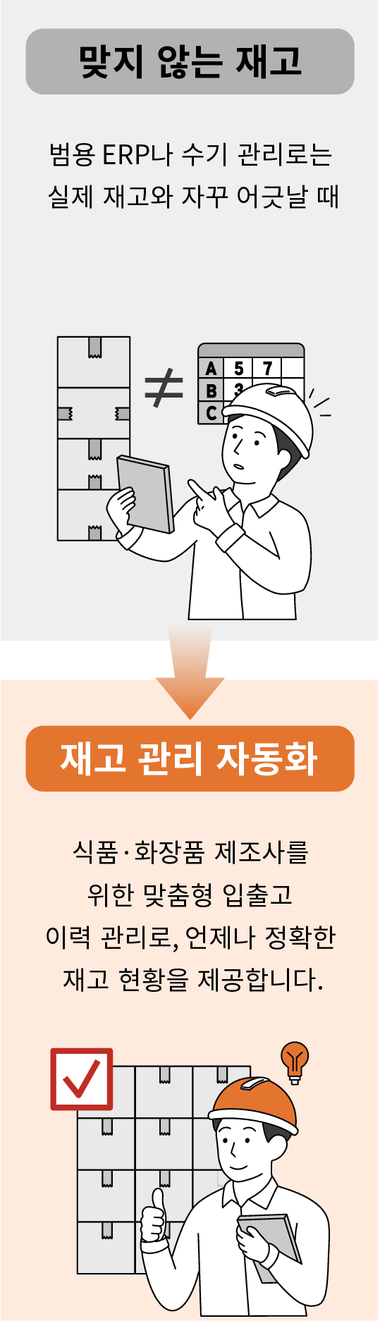 재고관리, 제조기록서 등 의무문서 자동작성 생산 현장의 데이터를 입력만 하면 제조기록서, 수불서류 등 법적 의무 문서가 자동 작성되어 ERP 전산작업 따로 법적 의무 문서 수기 작성을 따로 할 필요가 없습니다. |