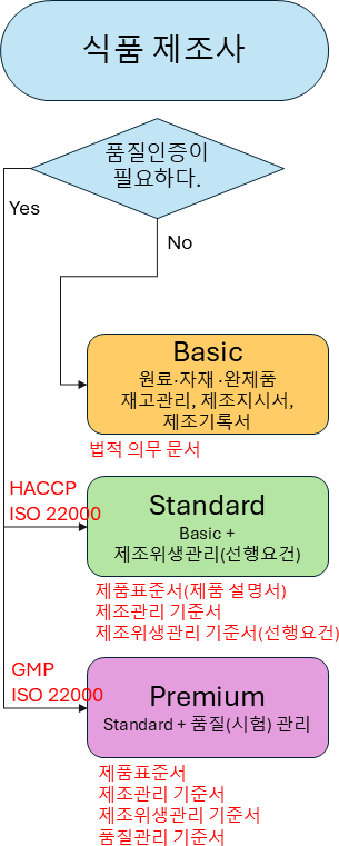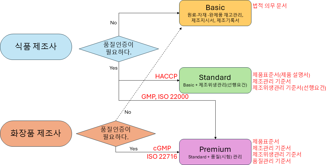 인증심사 대비 GMP, cGMP, HACCP, ISO 22000, ISO 22716 자체 평가를 통한 식약처, ISO 심사 및 거래처 심사에 대비할 수 있도록 설계되어져 있습니다. |
